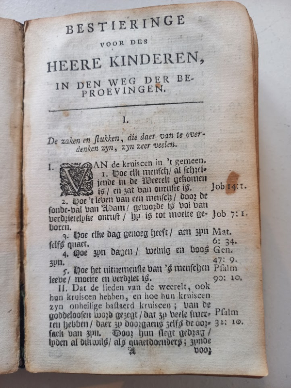 OverzichtBestieringe voor des Heeren Kinderen, een werkje over de beproevingen en drukwegen van ware gelovigen, door ds. Martinus Westerhout (1705-1793) te Rotterdam.