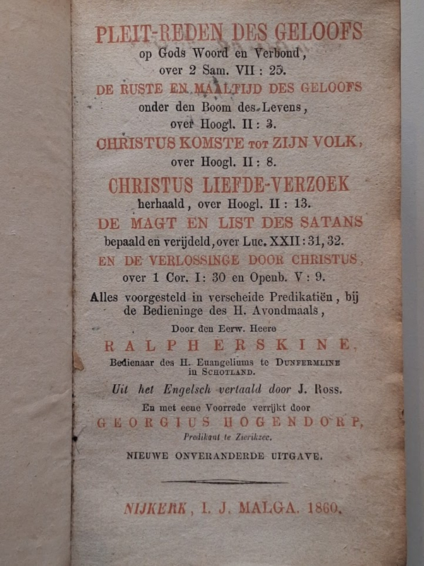 OverzichtPleit-Reden des Geloofs en De Wet van Gods Huis, twaalf preken van Ralph Erskine, Bedienaar des H. Evangeliums in Schotland, uitgegeven bij I.J. Malga te Nijkerk, 1860.