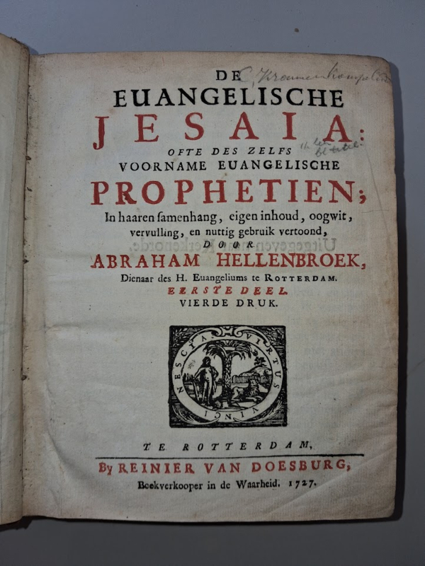 OverzichtDe Euangelische Jesaia ofte des zelfs voorname Euangelische Prophetien in haar samenhang, eige inhoud, oogwit, vervulling en nuttig gebruik vertoond, door Abraham Hellenbroek, Dienaar van het Euangeliums te Rotterdam.