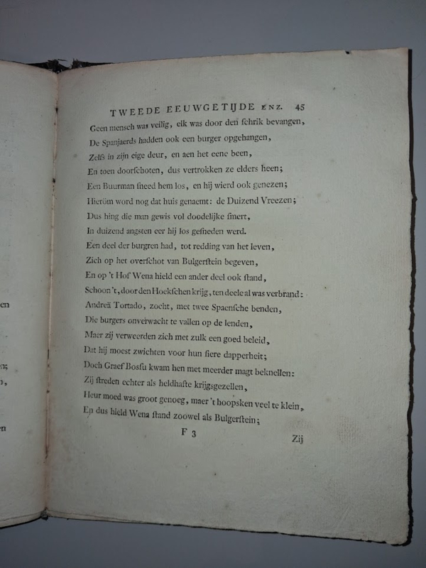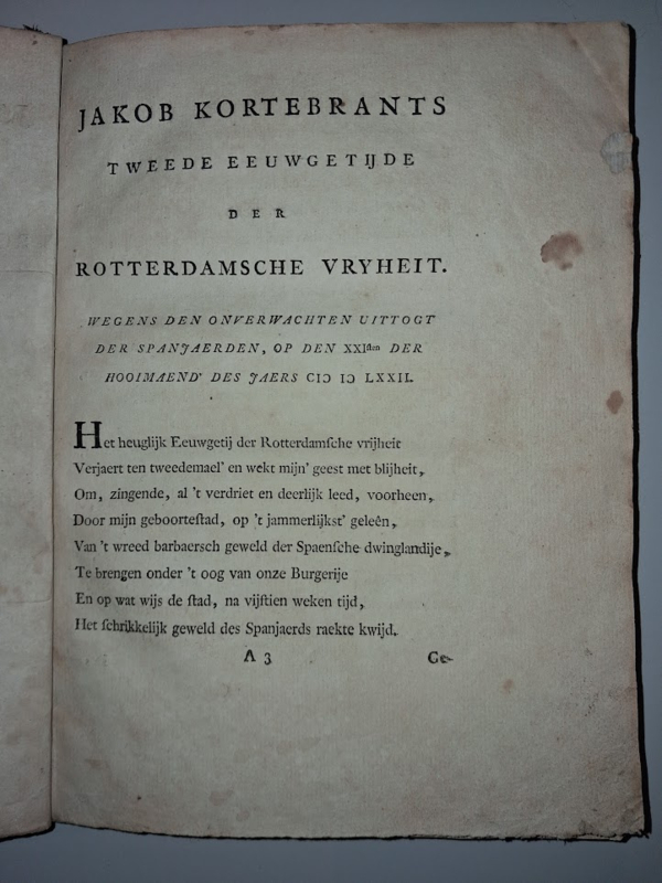 OverzichtTweede Eeuwgetijde der Rotterdamsche Vrijheit door Jakob Kortebrants. Wegens den onverwachten uittogt der Spanjaerden, op den XXIden der Hooimaend des Jaers 1572.