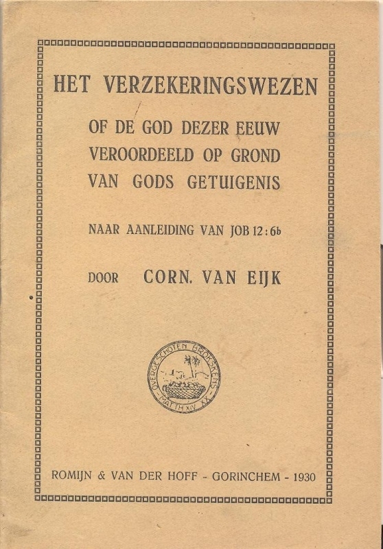 Eijk, Cor. van-Het verzekeringswezen of de god dezer eeuwHet Verzekeringswezen of de God dezer eeuw veroordeeld op grond van Gods Getuigenis naar aanleiding van Job 12:6b door Corn. van Eijk.