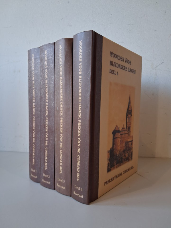 Mel, Dr. Conrad-Woorden voor bijzondere dagen (deel 1 t/m 4) (nieuw)Woorden voor bijzondere dagen, deel 1 t/m 4, 98 preken van dr. Conrad Mel, een Duitse, bevindelijke predikant, die van 1666 tot 1733 geleefd heeft.